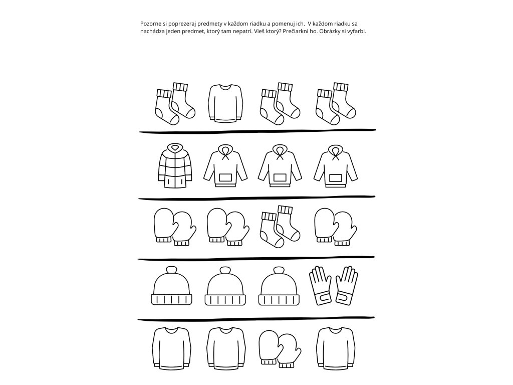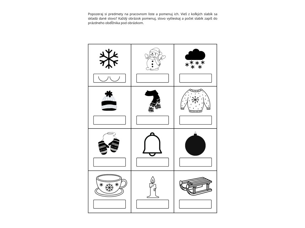 Každá strana pracovného zošita je určená na jeden deň, až do Vianoc. Jednotlivé úlohy sú zamerané na rozvoj grafomotoriky, vizuomotoriky, matematických predstáv a poznávania.