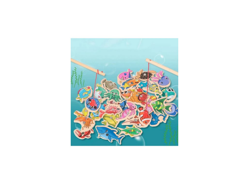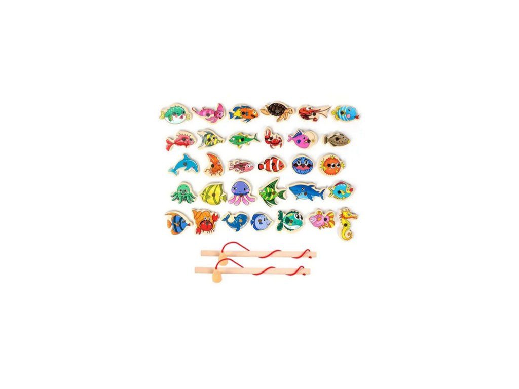 Ste pripravení vyraziť na ryby? Táto súprava obsahuje drevené rybky a 2 rybárske prúty. Deti pomocou drevených tyčí chytajú magnetické drevené rybky. Rybárska výprava môže začať!