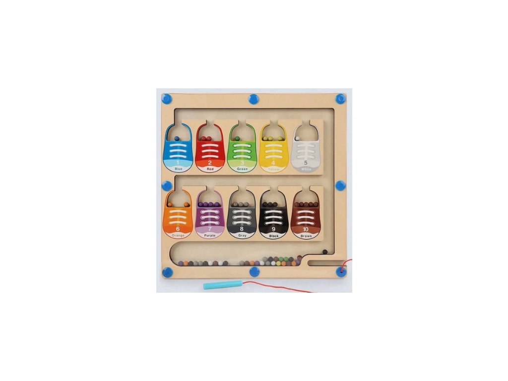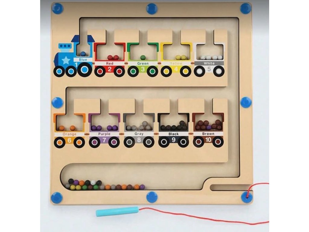 Pomocou magnetického pera deti presúvajú farebné guličky do príslušných otvorov podľa farby. Hra učí rozpoznávať farby a zároveň podporuje koordináciu rúk a očí. Bezpečné magnetické ovládanie guličiek robí hru zábavnou a zároveň výzvovou.