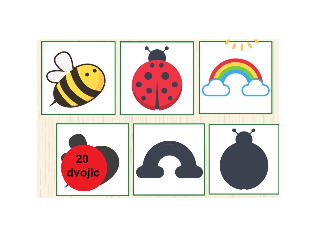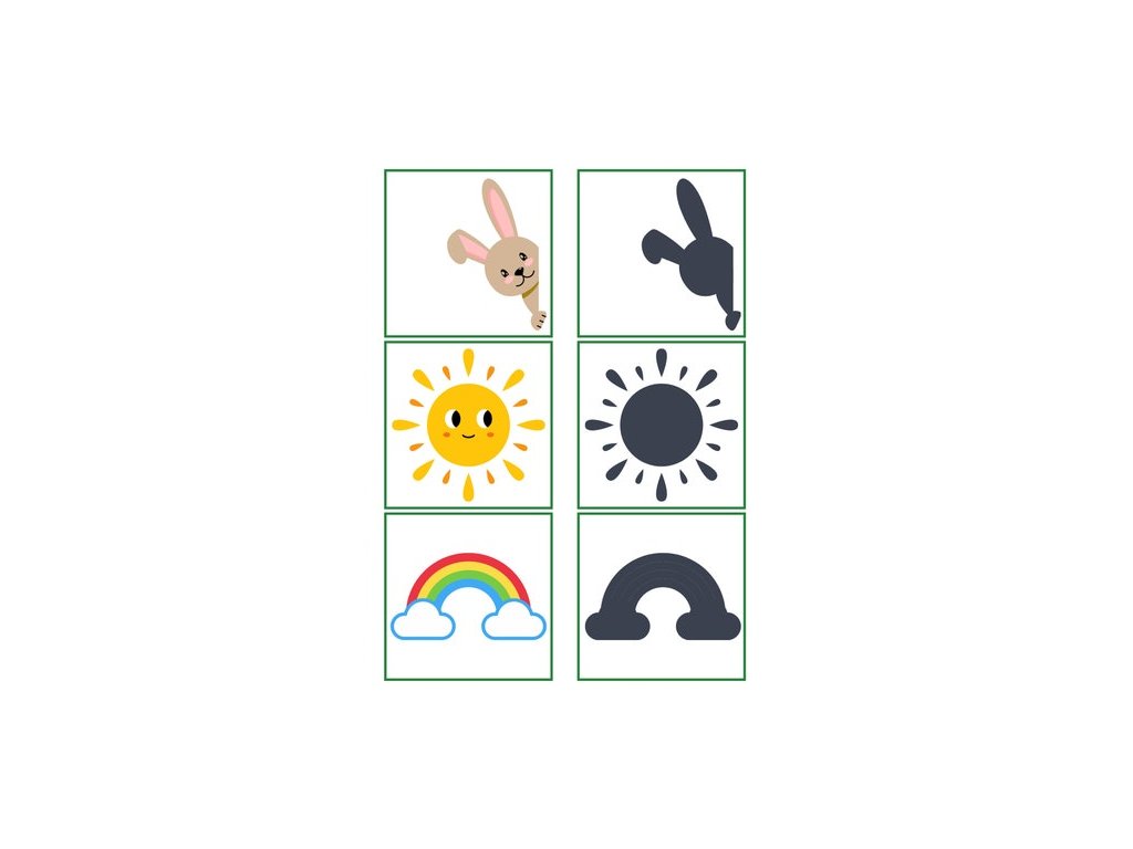 Sada obsahuje 40 kariet veľkosti A5, ktoré sú potiahnuté ochrannou fóliou pre ich opakované použitie. Deti zábavnou formou hľadajú tiene farebných obrázkov.