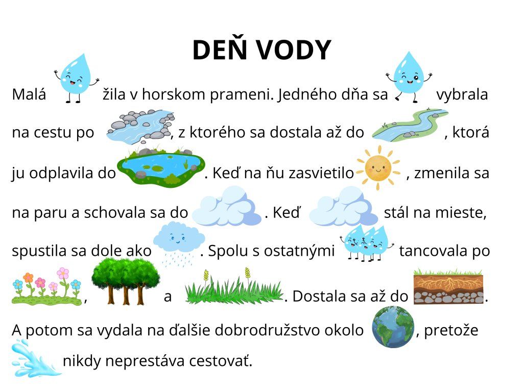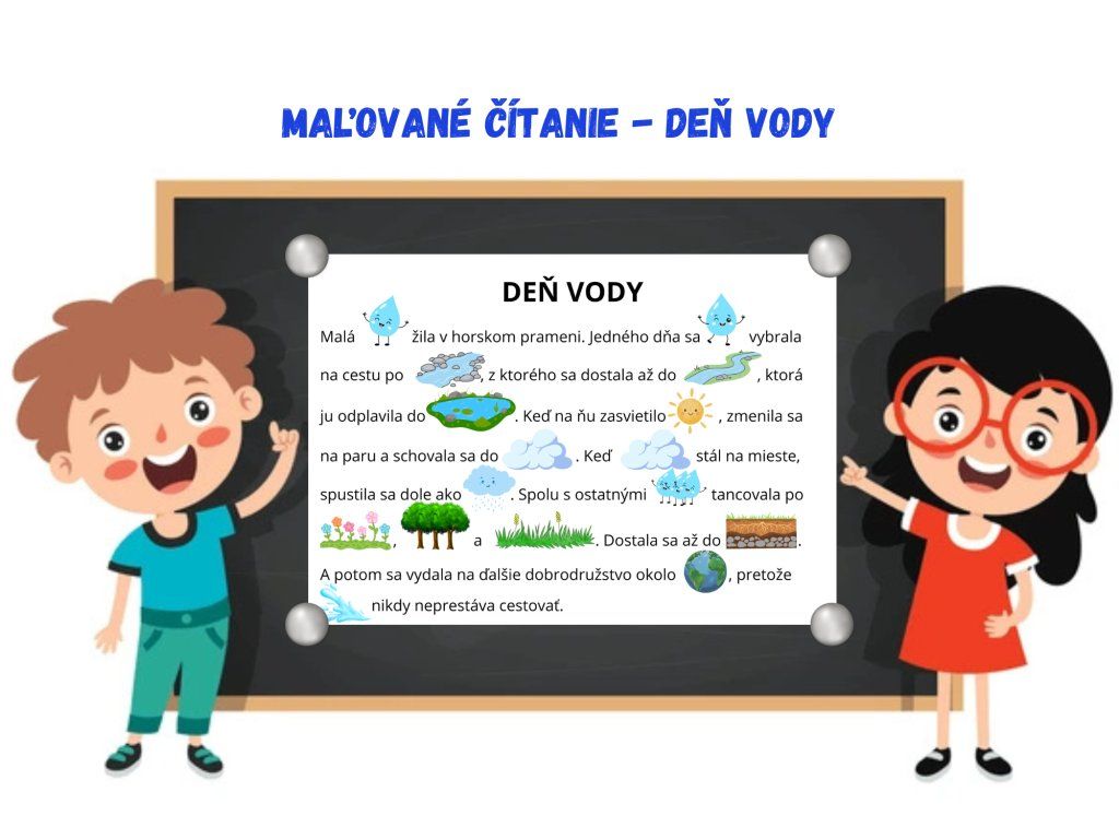 Maľované čítanie - Deň vody je obojstranný plagát rozmeru A1. Obsahuje jednu rozprávku, pričom na zadnej strane plagátu sú vysvetlivky ilustrácií nachádzajúcich sa v texte, ktoré slúžia na doplňujúce edukačný aktivity. Po prečítaní rozprávky deťom zadná strana umožní vymenovať hlavné a vedľajšie postavy, prerozprávať príbeh, tvoriť opozitá a mnoho iného.