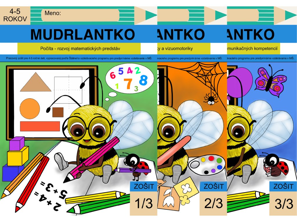 Sada troch pracovných zošitov pre deti vo veku 4-5 rokov: Mudrlantko Počíta + Kreslí + Poznáva.