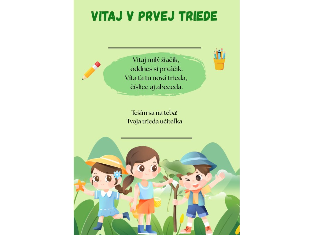 Uvítací list pre prvákov. Možnosť doplnenia názvu školy. V prípade záujmu napíšte názov školy do poznámky pri realizovaní objednávky.