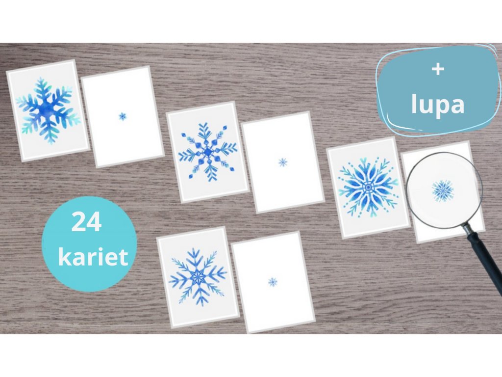12 kusov kariet predstavuje zväčšenú verziu snehových vločiek, zvyšných 12 kusov kariet ich zmenšenú verziu.